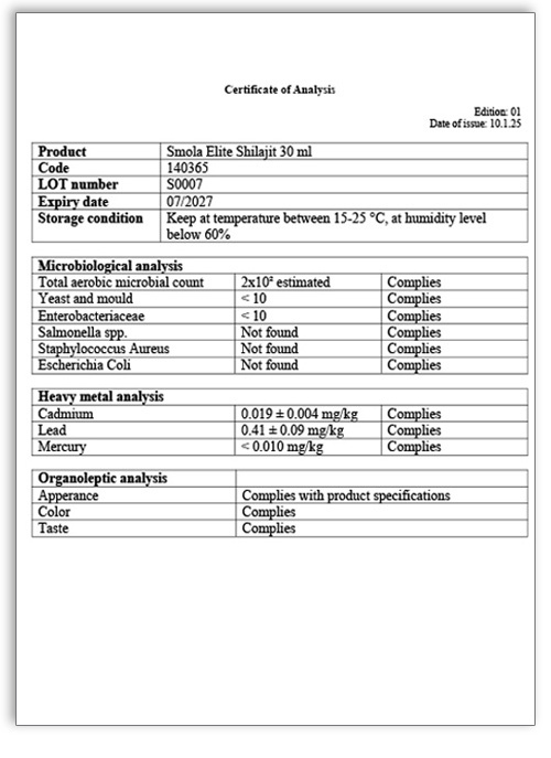 Výživový doplnok Elite Shilajit obsahuje viac ako 80 prospešných živín potrebných pre optimálne fungovanie ľudského tela. V prírode neexistuje žiadna látka bohatšia na živiny a minerály ako shilajit. Minerály sa nachádzajú v iónovej forme, čo umožňuje telu ich ľahkú absorpciu a využitie pre rast a konzerváciu buniek. Fulvické a humínové kyseliny v doplnku výživy Elite Shilajit ďalej zvyšujú vstrebávanie a účinok iných užívaných liekov a doplnkov výživy.